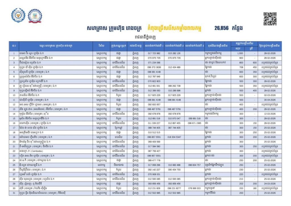 (ភ្នំពេញ)៖ រាជធានីភ្នំពេញ ដែលជាមជ្ឈមណ្ឌលសេដ្ឋកិច្ច និងពាណិជ្ជកម្មនោះ មានឱកាសការងារជាង ២ម៉ឺនកន្លែង សម្រាប់ផ្ដល់ជូនអតីតពលករត្រឡប់មកពីប្រទេសថៃ និងអ្នកកំពុងស្វែងរកការងារធ្វើ។ នេះបើតាមឱ្យដឹងពីក្រសួងការងារ និងបណ្ដុះបណ្ដាលវិជ្ជាជីវៈដែលបានផ្សព្វផ្សាយកាលពីពេលថ្មីៗនេះ។ តាមរយៈការផ្សព្វផ្សាយ ក្រសួងការងារ បានឱ្យដឹងថា គិតត្រឹមថ្ងៃទី១៣ ខែកុម្ភៈ ឆ្នាំ២០២៦នេះ រាជធានីភ្នំពេញ មានឱកាសការងារសរុបចំនួនជាង ២,៦ម៉ឺនកន្លែង កំពុងរង់ចាំបងប្អូនអតីតពលករត្រឡប់មកពីប្រទេសថៃ និងប្រជាពលរដ្ឋដែលកំពុងស្វែងរកការងារធ្វើ។ ឱកាសការងារទាំងនោះ ស្ថិតនៅក្នុងវិស័យឧស្សាហកម្ម និងសេវាកម្ម។ ដើម្បីទទួលបានឱកាសការងារទាំងនោះ បងប្អូនអតីតពលករត្រឡប់មកពីប្រទេសថៃ និងអ្នកកំពុងស្វែងរកការងារធ្វើ អាចស្វែងរកលេខទំនាក់ទំនង ឈ្មោះរោងចក្រ និងវិស័យដែលខ្លួនពេញចិត្តបានតាមរយៈខិតបណ្ណការងាររបស់ក្រសួងដែលបានផ្សព្វផ្សាយយ៉ាងលម្អិត។ ជាមួយគ្នានេះ ក្រៅពីទំនាក់ទំនងផ្ទាល់ជាមួយរោងចក្រ សហគ្រាស និងរោងចក្រផ្ទាល់ អ្នកស្វែងរកការងារទាំងអស់ ជាពិសេសបងប្អូនអតីតពលករ ក៏អាចទាក់ទងមកប្រព័ន្ធទំនាក់ទំនងបន្ទាន់ ១២៩៧ ដើម្បីឱ្យក្រសួងការងារជួយសម្របសម្រួលស្វែងរកការងារជូនផងដែរ។ នេះបើតាមក្រសួងការងារដដែល៕