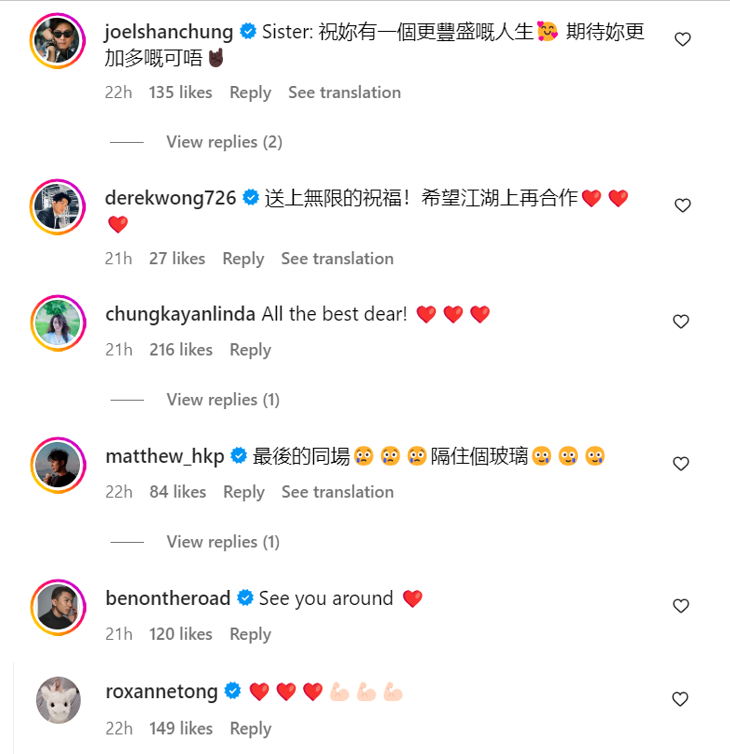Mandy Wong បាននិយាយថា៖ “ខ្ញុំទន្ទឹងរង់ចាំជួបជាមួយនឹងតួអង្គច្រើនទៀតនៅលើឆាកផ្សេងៗ និងការ challenge ថ្មីៗបន្ថែមទៀត។ ខ្ញុំត្រៀមខ្លួនរួចរាល់ហើយ!” ។ នៅក្នុង comment គេសង្កេតឃើញមានតារាល្បីៗហុងកុងជាច្រើនរួមមាន Joel Chan, Derek Wong, Linda Chung, Matthew Ho, Benjamin Yuen និង Roxanne Tong ក៏បានផ្ញើពាក្យជូនពររបស់ពួកគេទៅកាន់ Mandy ផងដែរ។