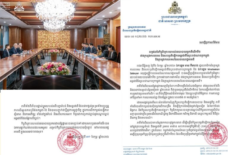 (ភ្នំពេញ)៖ បើតាមសេចក្តីប្រកាសព័ត៌មានរបស់ ក្រសួងការបរទេស និងសហប្រតិបត្តិការអន្តរជាតិកម្ពុជា ចេញផ្សាយនៅថ្ងៃទី១១ ខែកុម្ភៈ ឆ្នាំ២០២៦ បានឱ្យដឹងថា កម្ពុជា និងអាមេនី បន្តពង្រឹងកិច្ចសហប្រតិបត្តិការលើគ្រប់វិស័យ ដើម្បីលើកកម្ពស់មិត្តភាព និងការយោគយល់គ្នាទៅវិញទៅមក។ គួររំលឹកថា កាលពីថ្ងៃទី៦ ខែកុម្ភៈ ឆ្នាំ២០២៦ មាស គឹមហេង រដ្ឋលេខាធិការនៃក្រសួងការបរទេស…